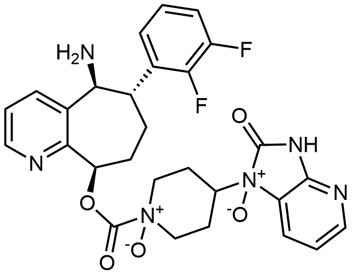 Synonyms: 1-(1-((((5S,6S,9R)-5-amino-6-(2,3-difluorophenyl)-6,7,8,9-tetrahydro-5H-cyclohepta[b]pyridin-9-yl)oxy)carbonyl)-1-oxidopiperidin-4-yl)-2-oxo-2,3-dihydro-1H-imidazo[4,5-b]pyridine 1-oxide