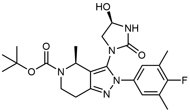 Synonyms: tert-butyl (S)-2-(4-fluoro-3,5-dimethylphenyl)-3-((R)-4-hydroxy-2-oxoimidazolidin-1-yl)-4-methyl-2,4,6,7-tetrahydro-5H-pyrazolo[4,3-c]pyridine-5-carboxylate