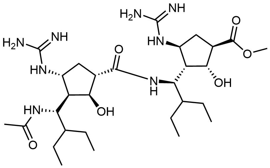 Synonyms: methyl (1R,2R,3S,4S)-3-((R)-1-((1S,2S,3R,4R)-3-((S)-1-acetamido-2-ethylbutyl)-4-guanidino-2-hydroxycyclopentane-1-carboxamido)-2-ethylbutyl)-4-guanidino-2-hydroxycyclopentane-1-carboxylate