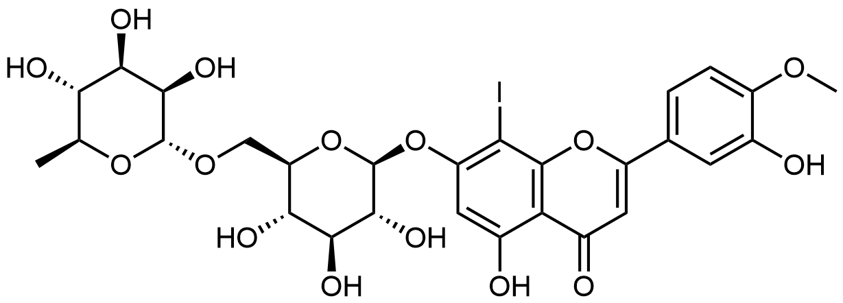 Synonyms: 5-hydroxy-2-(3-hydroxy-4-methoxyphenyl)-8-iodo-7-(((2S,3R,4S,5S,6R)-3,4,5-trihydroxy-6-((((2R,3R,4R,5R,6S)-3,4,5-trihydroxy-6-methyltetrahydro-2H-pyran-2-yl)oxy)methyl)tetrahydro-2H-pyran-2-yl)oxy)-4H-chromen-4-one