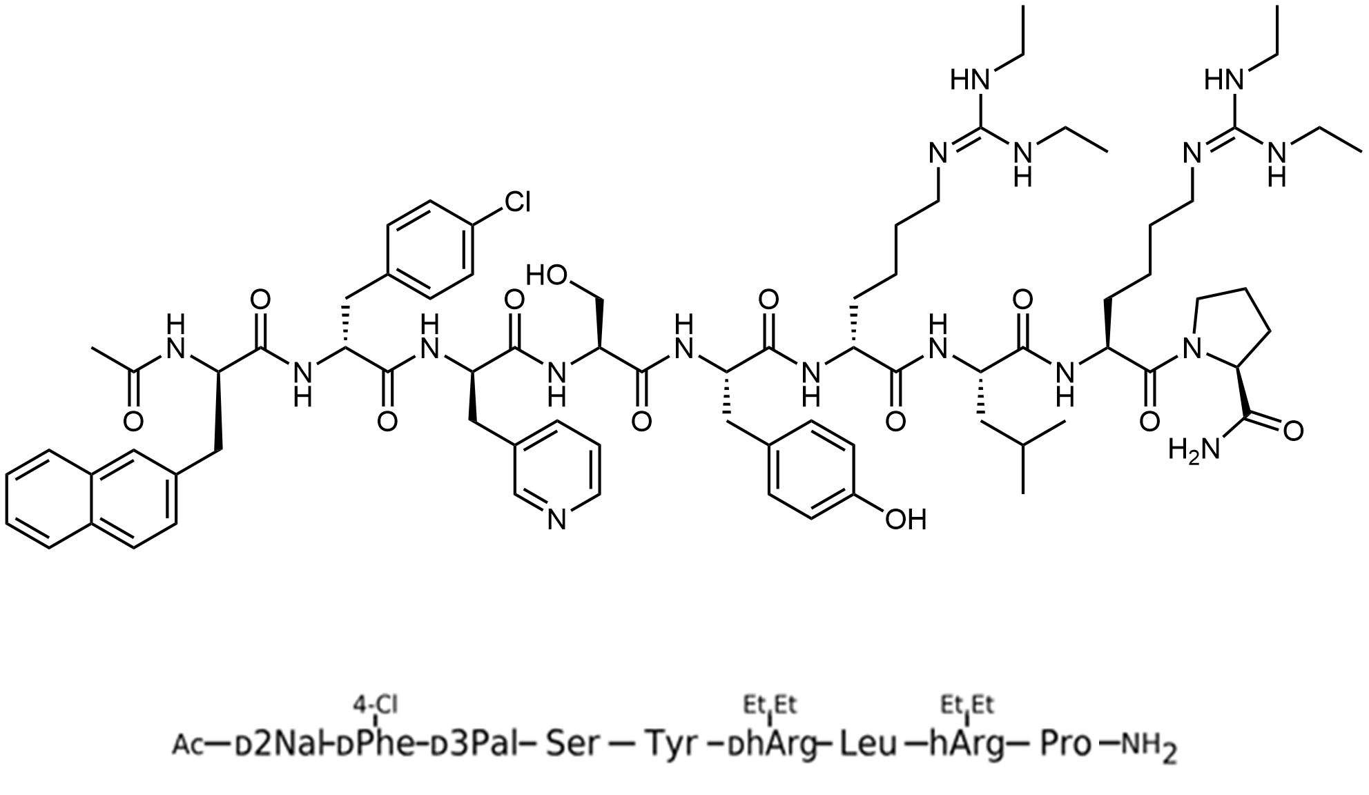 Synonyms: (S)-1-(N2-N2-((R)-2-((R)-2-((R)-2-acetamido-3-(naphthalen-2-yl)propanamido)-3-(4-chlorophenyl)propanamido)-3-(pyridin-3-yl)propanoyl)-L-seryl-L-tyrosyl-N6-(bis(ethylamino)methylene)-D-lysyl-L-leucyl-N6-(bis(ethylamino)methylene)-L-lysyl)pyrrolidine-2-carboxamide