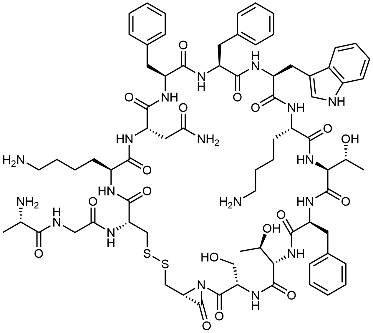 Synonyms: (S)-N-(2-(((3S,6S,9S,12S,15S,18S,21S,24S,27S,30S,33R,38R)-18-((1H-indol-3-yl)methyl)-27-(2-amino-2-oxoethyl)-15,30-bis(4-aminobutyl)-9,21,24-tribenzyl-6,12-bis((R)-1-hydroxyethyl)-3-(hydroxymethyl)-2,5,8,11,14,17,20,23,26,29,32,39-dodecaoxo-35,36-dithia-1,4,7,10,13,16,19,22,25,28,31-undecaazabicyclo[36.1.0]nonatriacontan-33-yl)amino)-2-oxoethyl)-2-aminopropanamide