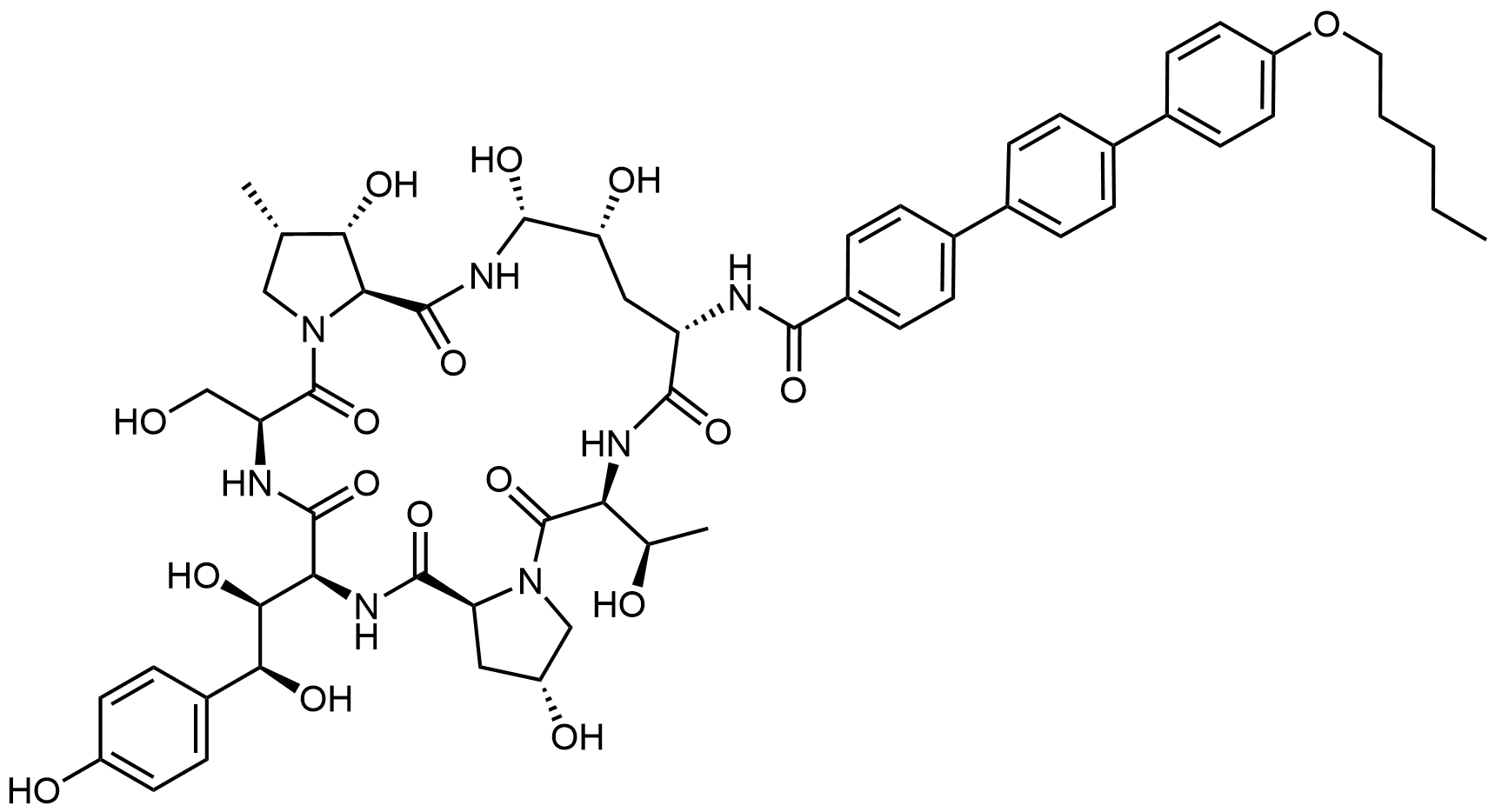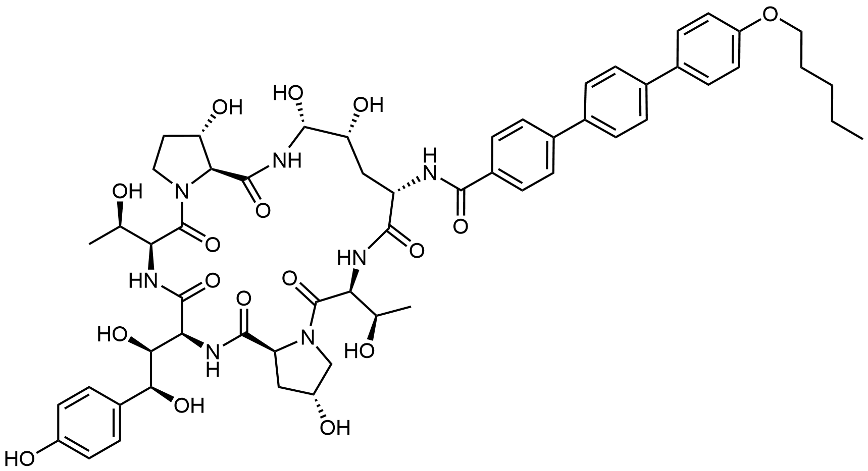Synonyms: 4-((1S,2S)-1,2-dihydroxy-2-((2R,6S,9S,11R,12R,14aS,15S,16S,20S,23S,25aS)-2,11,12,15-tetrahydroxy-6,20-bis((R)-1-hydroxyethyl)-16-methyl-5,8,14,19,22,25-hexaoxo-9-(4''-(pentyloxy)-[1,1':4',1''-terphenyl]-4-carboxamido)tetracosahydro-1H-dipyrrolo[2,1-c:2',1'-l][1,4,7,10,13,16]hexaazacyclohenicosin-23-yl)ethyl)phenyl 4''-(pentyloxy)-[1,1':4',1''-terphenyl]-4-carboxylate