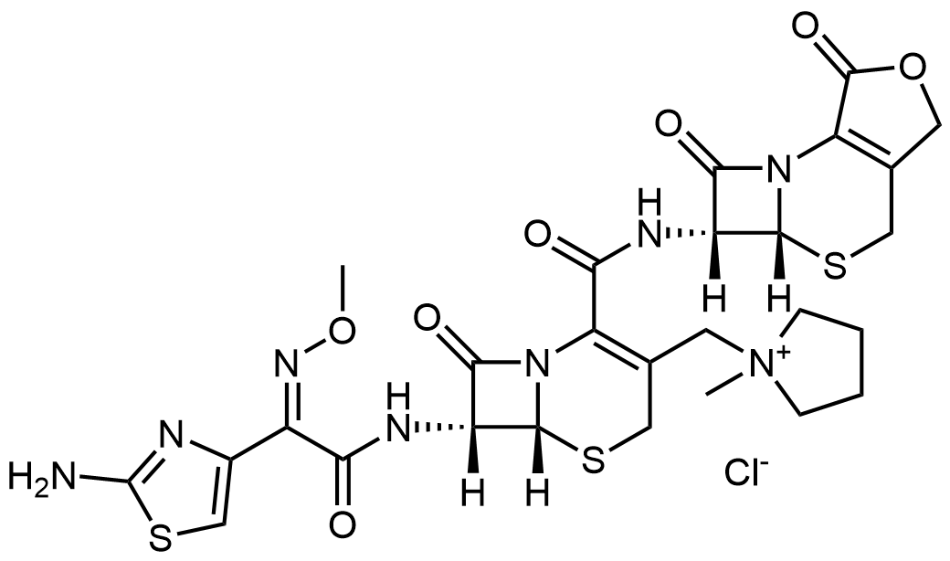 Synonyms: 1-(((6R,7R)-7-((Z)-2-(2-aminothiazol-4-yl)-2-(methoxyimino)acetamido)-2-(((5aR,6R)-1,7-dioxo-1,4,5a,6-tetrahydro-3H,7H-azeto[2,1-b]furo[3,4-d][1,3]thiazin-6-yl)carbamoyl)-8-oxo-5-thia-1-azabicyclo[4.2.0]oct-2-en-3-yl)methyl)-1-methylpyrrolidin-1-ium chloride