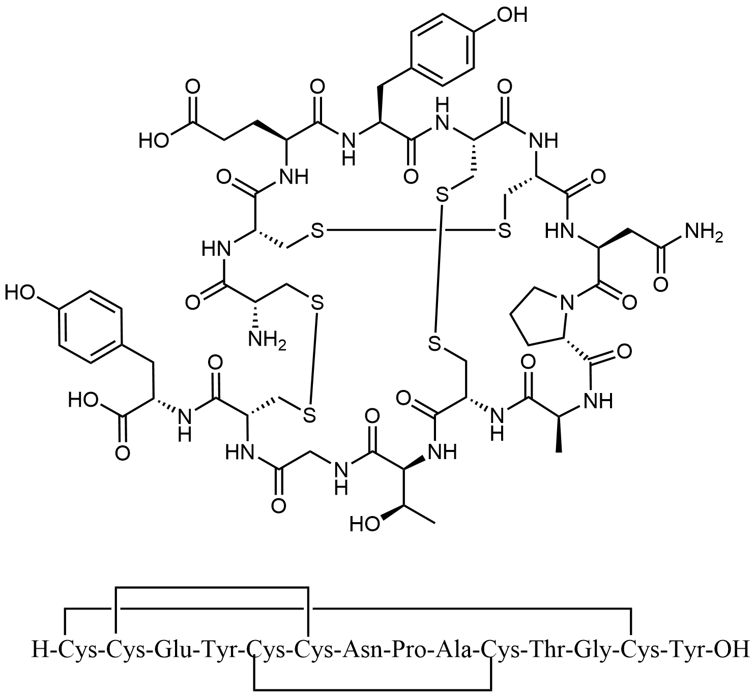 Synonyms: ((3S,6R,9S,15R,20R,23R,26S,29S,32R,35R,38S,43aS)-20-amino-38-(2-amino-2-oxoethyl)-26-(2-carboxyethyl)-29-(4-hydroxybenzyl)-9-((R)-1-hydroxyethyl)-3-methyl-1,4,7,10,13,21,24,27,30,33,36,39-dodecaoxotetracontahydro-19H-6,32:23,35-bis(methanodithiomethano)pyrrolo[2,1-s][1,2]dithia[5,8,11,14,17,20,23,26,29,32,35,38]dodecaazacyclohentetracontine-15-carbonyl)-L-tyrosine