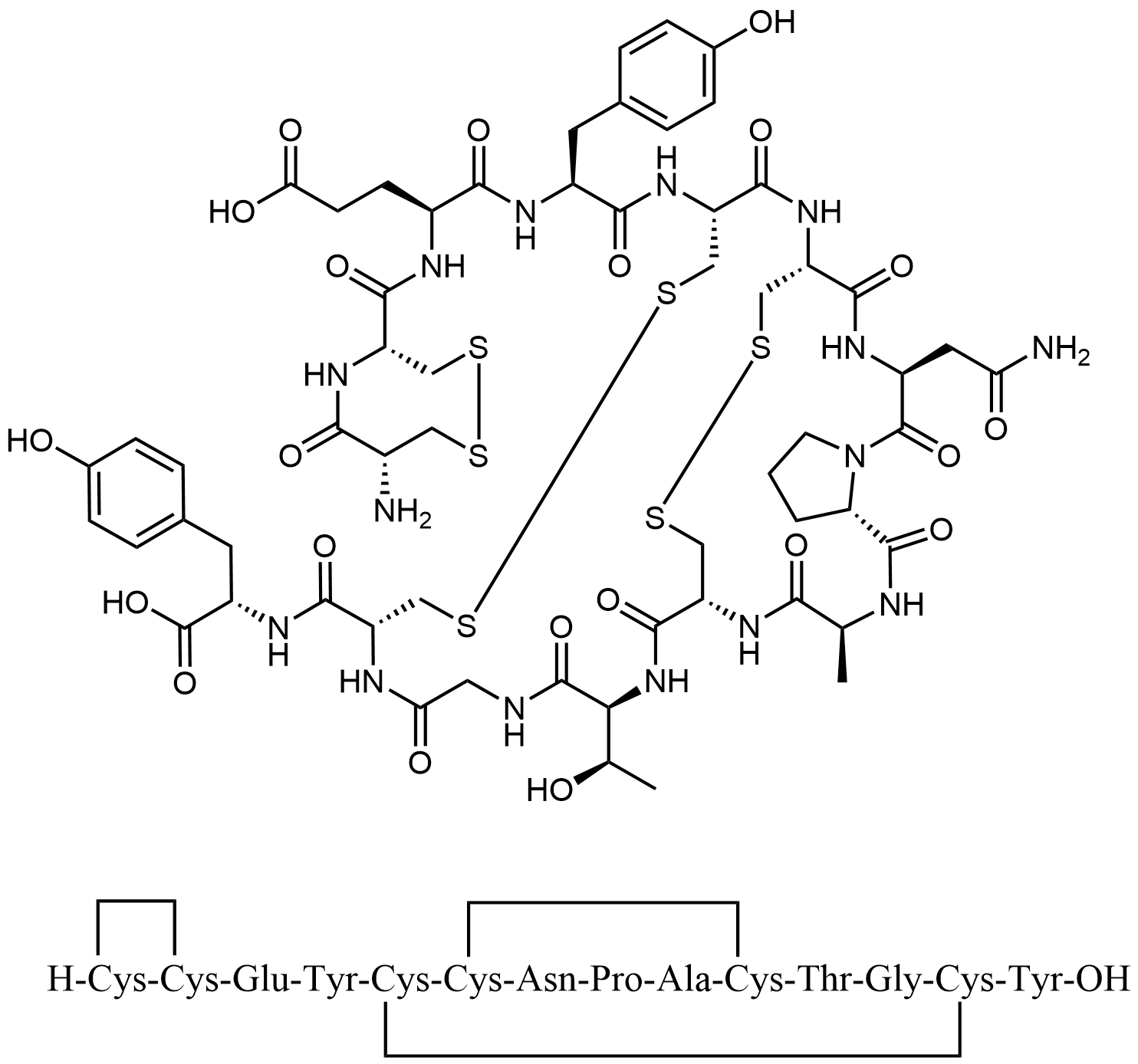 Synonyms: (S)-5-(((S)-1-(((3S,6R,9S,15R,20R,23R,26S,31aS)-26-(2-amino-2-oxoethyl)-15-(((S)-1-carboxy-2-(4-hydroxyphenyl)ethyl)carbamoyl)-9-((R)-1-hydroxyethyl)-3-methyl-1,4,7,10,13,21,24,27-octaoxooctacosahydro-19H-6,23-(methanodithiomethano)pyrrolo[2,1-s][1,2]dithia[5,8,11,14,17,20,23,26]octaazacyclononacosin-20-yl)amino)-3-(4-hydroxyphenyl)-1-oxopropan-2-yl)amino)-4-((4S,7R)-7-amino-6-oxo-1,2,5-dithiazocane-4-carboxamido)-5-oxopentanoic acid