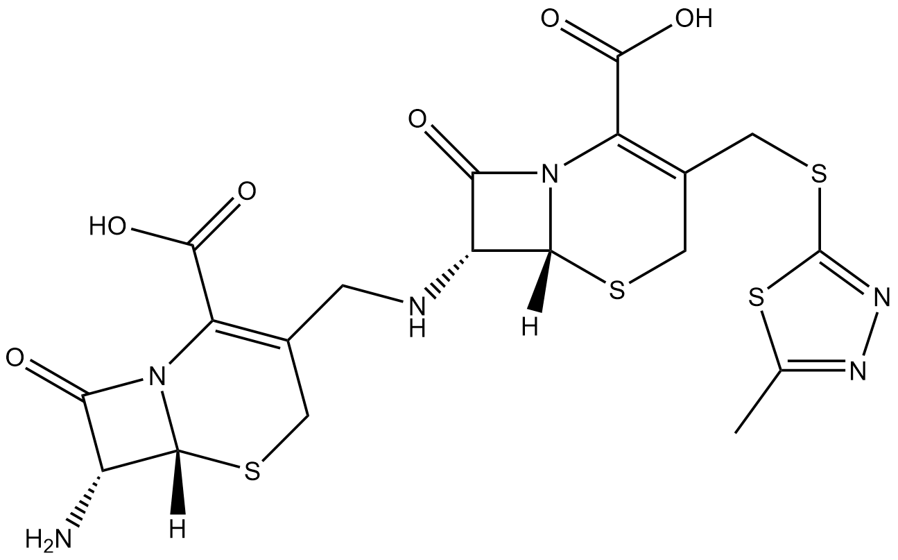 Synonyms: (6R,7R)-7-amino-3-((((6R,7R)-2-carboxy-3-(((5-methyl-1,3,4-thiadiazol-2-yl)thio)methyl)-8-oxo-5-thia-1-azabicyclo[4.2.0]oct-2-en-7-yl)amino)methyl)-8-oxo-5-thia-1-azabicyclo[4.2.0]oct-2-ene-2-carboxylic acid
