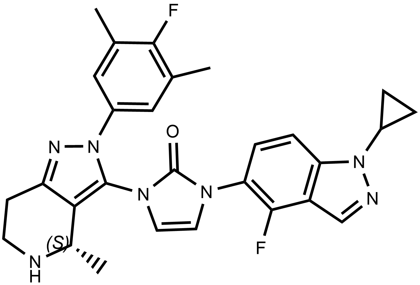 Synonyms: (S)-1-(1-cyclopropyl-4-fluoro-1H-indazol-5-yl)-3-(2-(4-fluoro-3,5-dimethylphenyl)-4-methyl-4,5,6,7-tetrahydro-2H-pyrazolo[4,3-c]pyridin-3-yl)-1,3-dihydro-2H-imidazol-2-one