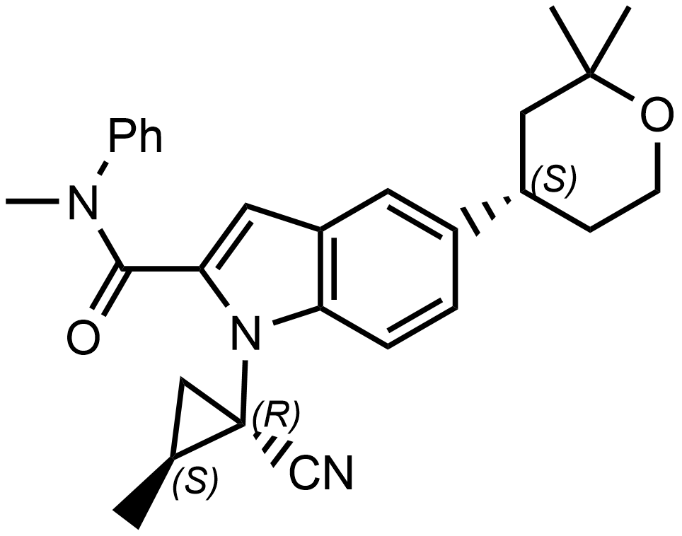 Synonyms: 1-((1R,2S)-1-cyano-2-methylcyclopropyl)-5-((S)-2,2-dimethyltetrahydro-2H-pyran-4-yl)-N-methyl-N-phenyl-1H-indole-2-carboxamide