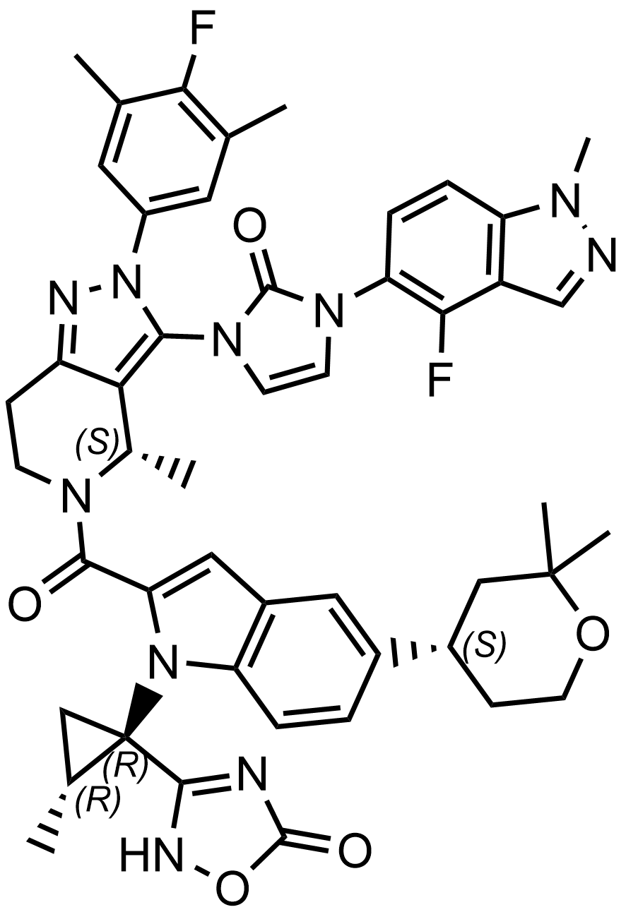 Synonyms: 3-((1R,2R)-1-(5-((S)-2,2-dimethyltetrahydro-2H-pyran-4-yl)-2-((S)-3-(3-(4-fluoro-1-methyl-1H-indazol-5-yl)-2-oxo-2,3-dihydro-1H-imidazol-1-yl)-2-(4-fluoro-3,5-dimethylphenyl)-4-methyl-4,5,6,7-tetrahydro-2H-pyrazolo[4,3-c]pyridine-5-carbonyl)-1H-indol-1-yl)-2-methylcyclopropyl)-1,2,4-oxadiazol-5(2H)-one