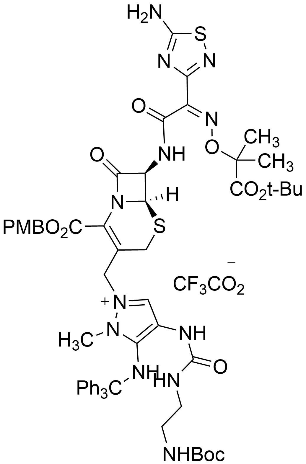 Synonyms: 2-(((6R,7R)-7-((Z)-2-(5-amino-1,2,4-thiadiazol-3-yl)-2-(((1-(tert-butoxy)-2-methyl-1-oxopropan-2-yl)oxy)imino)acetamido)-2-(((4-methoxybenzyl)oxy)carbonyl)-8-oxo-5-thia-1-azabicyclo[4.2.0]oct-2-en-3-yl)methyl)-4-(3-(2-((tert-butoxycarbonyl)amino)ethyl)ureido)-1-methyl-5-(tritylamino)-1H-pyrazol-2-ium 2,2,2-trifluoroacetate