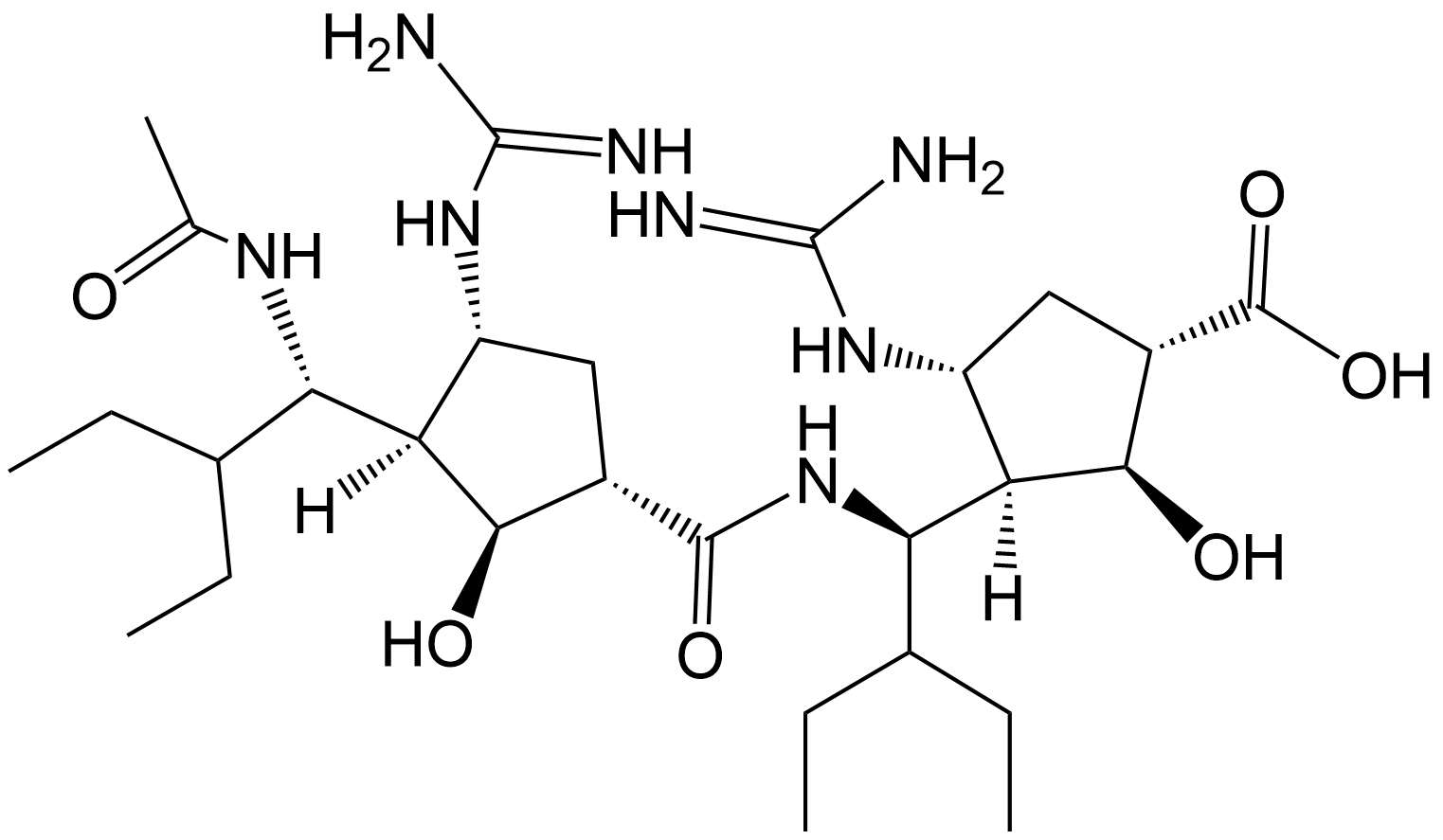 Synonyms: (1S,2S,3R,4R)-3-((R)-1-((1S,2S,3R,4R)-3-((S)-1-acetamido-2-ethylbutyl)-4-guanidino-2-hydroxycyclopentane-1-carboxamido)-2-ethylbutyl)-4-guanidino-2-hydroxycyclopentane-1-carboxylic acid
