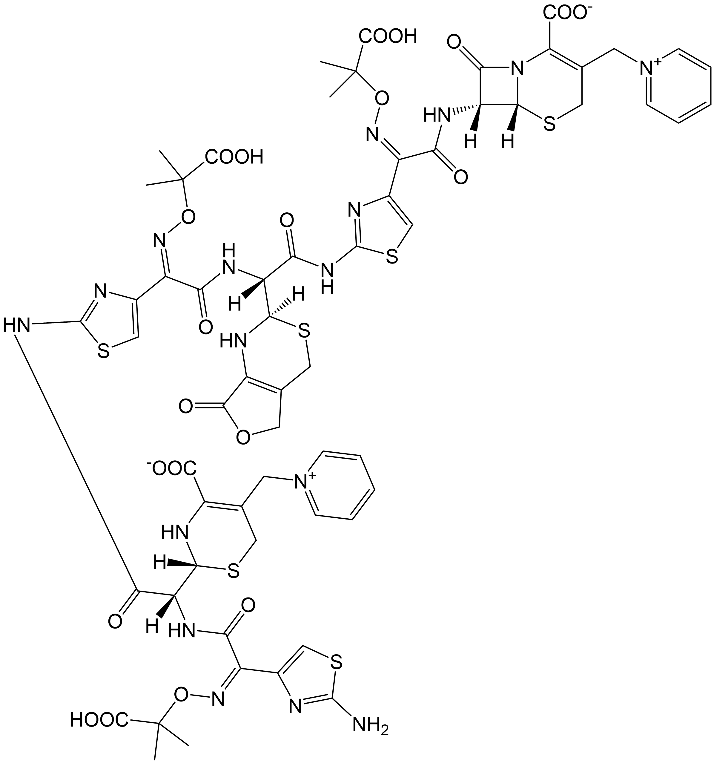 Synonyms: (6R,7R)-7-((Z)-2-(2-((R)-2-((Z)-2-(2-((R)-2-((Z)-2-(2-aminothiazol-4-yl)-2-(((2-carboxypropan-2-yl)oxy)imino)acetamido)-2-((R)-4-carboxylato-5-(pyridin-1-ium-1-ylmethyl)-3,6-dihydro-2H-1,3-thiazin-2-yl)acetamido)thiazol-4-yl)-2-(((2-carboxypropan-2-yl)oxy)imino)acetamido)-2-((R)-7-oxo-1,2,5,7-tetrahydro-4H-furo[3,4-d][1,3]thiazin-2-yl)acetamido)thiazol-4-yl)-2-(((2-carboxypropan-2-yl)oxy)imino)acetamido)-8-oxo-3-(pyridin-1-ium-1-ylmethyl)-5-thia-1-azabicyclo[4.2.0]oct-2-ene-2-carboxylate