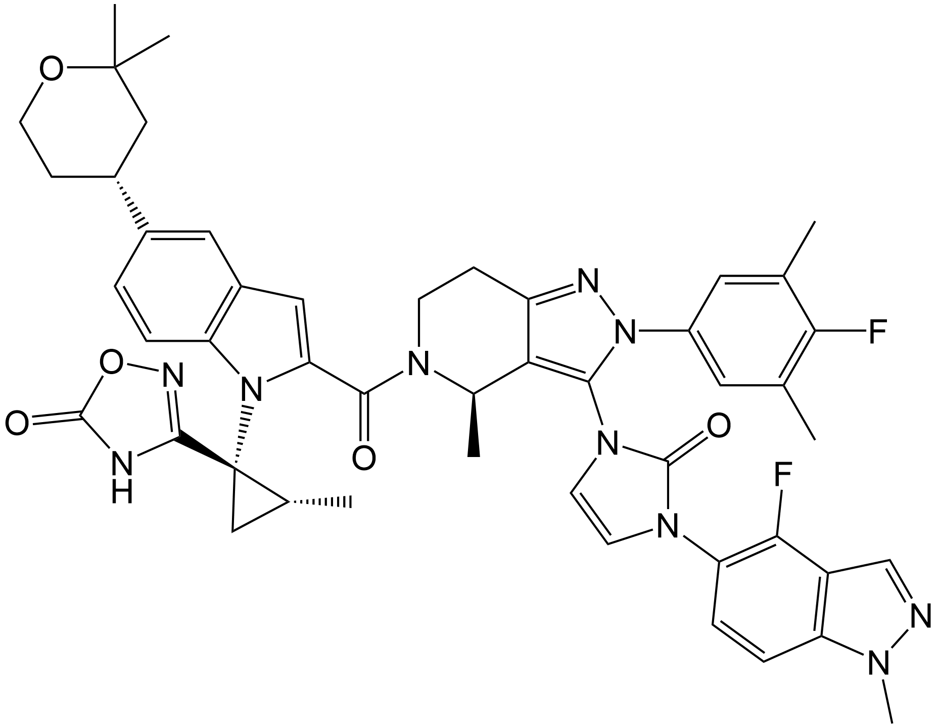 Synonyms: 3-((1S,2R)-1-(5-((R)-2,2-dimethyltetrahydro-2H-pyran-4-yl)-2-((R)-3-(3-(4-fluoro-1-methyl-1H-indazol-5-yl)-2-oxo-2,3-dihydro-1H-imidazol-1-yl)-2-(4-fluoro-3,5-dimethylphenyl)-4-methyl-4,5,6,7-tetrahydro-2H-pyrazolo[4,3-c]pyridine-5-carbonyl)-1H-indol-1-yl)-2-methylcyclopropyl)-1,2,4-oxadiazol-5(4H)-one