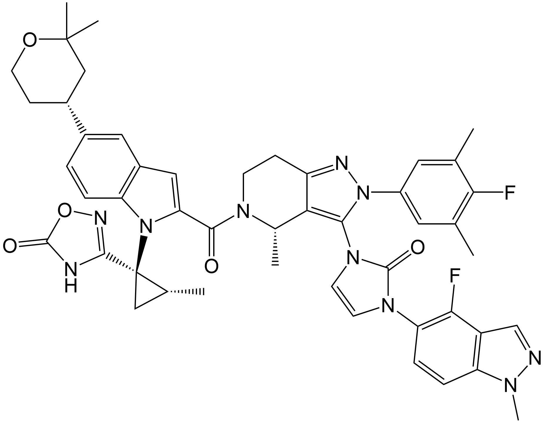 Synonyms: 3-((1R,2R)-1-(5-((R)-2,2-dimethyltetrahydro-2H-pyran-4-yl)-2-((S)-3-(3-(4-fluoro-1-methyl-1H-indazol-5-yl)-2-oxo-2,3-dihydro-1H-imidazol-1-yl)-2-(4-fluoro-3,5-dimethylphenyl)-4-methyl-4,5,6,7-tetrahydro-2H-pyrazolo[4,3-c]pyridine-5-carbonyl)-1H-indol-1-yl)-2-methylcyclopropyl)-1,2,4-oxadiazol-5(4H)-one