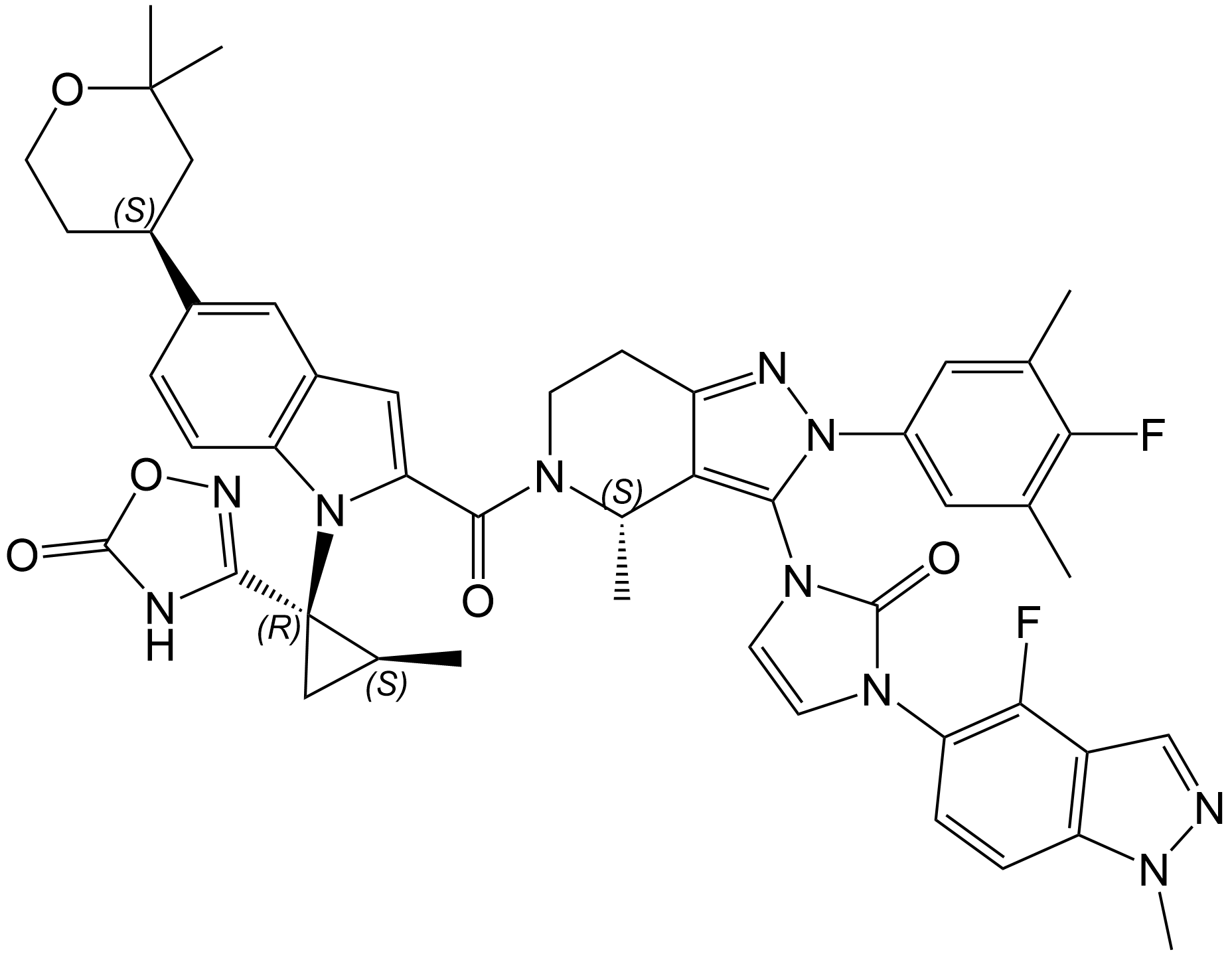 Synonyms: 3-((1R,2S)-1-(5-((S)-2,2-dimethyltetrahydro-2H-pyran-4-yl)-2-((S)-3-(3-(4-fluoro-1-methyl-1H-indazol-5-yl)-2-oxo-2,3-dihydro-1H-imidazol-1-yl)-2-(4-fluoro-3,5-dimethylphenyl)-4-methyl-4,5,6,7-tetrahydro-2H-pyrazolo[4,3-c]pyridine-5-carbonyl)-1H-indol-1-yl)-2-methylcyclopropyl)-1,2,4-oxadiazol-5(4H)-one