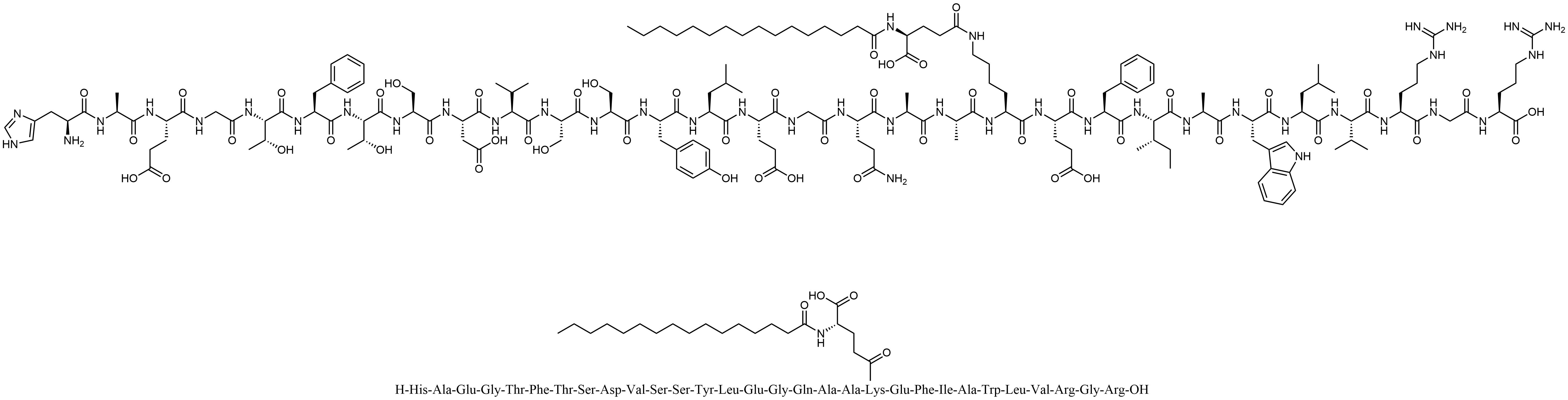 Synonyms: N5-((2S,5S,8S,11S,14S,17S)-17-((S)-2-((S)-2-((S)-5-amino-2-(2-((S)-2-((S)-2-((S)-2-((S)-2-((S)-2-((S)-2-((S)-2-((S)-2-((2S,3R)-2-((S)-2-((2S,3R)-2-(2-((S)-2-((S)-2-((S)-2-amino-3-(1H-imidazol-4-yl)propanamido)propanamido)-4-carboxybutanamido)acetamido)-3-hydroxybutanamido)-3-phenylpropanamido)-3-hydroxybutanamido)-3-hydroxypropanamido)-3-carboxypropanamido)-3-methylbutanamido)-3-hydroxypropanamido)-3-hydroxypropanamido)-3-(4-hydroxyphenyl)propanamido)-4-methylpentanamido)-4-carboxybutanamido)acetamido)-5-oxopentanamido)propanamido)propanamido)-11-benzyl-8-((S)-sec-butyl)-2-(((S)-1-(((S)-1-(((S)-1-((2-(((S)-1-carboxy-4-guanidinobutyl)amino)-2-oxoethyl)amino)-5-guanidino-1-oxopentan-2-yl)amino)-3-methyl-1-oxobutan-2-yl)amino)-4-methyl-1-oxopentan-2-yl)carbamoyl)-14-(2-carboxyethyl)-1-(1H-indol-3-yl)-5-methyl-4,7,10,13,16-pentaoxo-3,6,9,12,15-pentaazahenicosan-21-yl)-N2-palmitoyl-L-glutamine