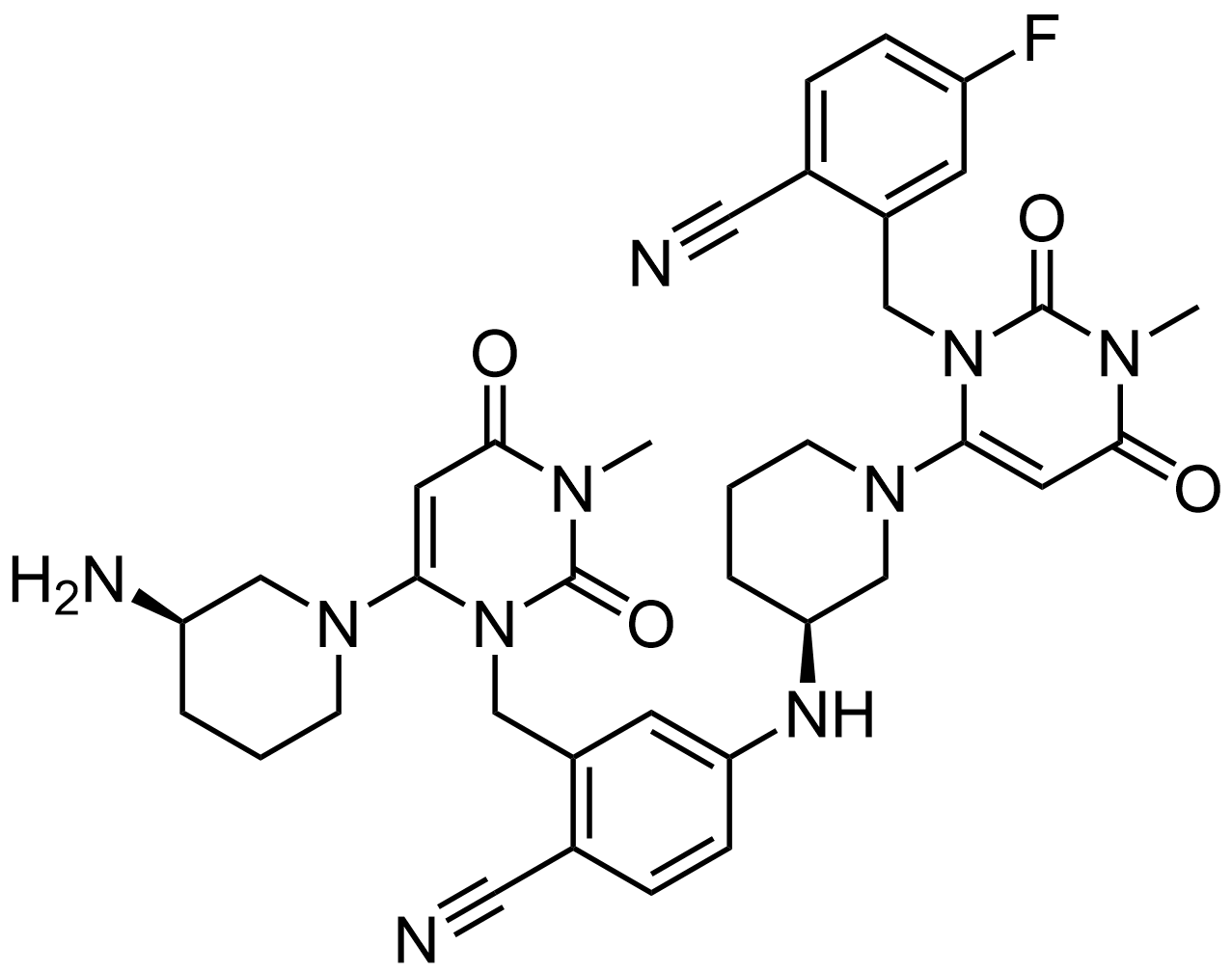 Synonyms: 2-((6-((R)-3-aminopiperidin-1-yl)-3-methyl-2,4-dioxo-3,4-dihydropyrimidin-1(2H)-yl)methyl)-4-(((S)-1-(3-(2-cyano-5-fluorobenzyl)-1-methyl-2,6-dioxo-1,2,3,6-tetrahydropyrimidin-4-yl)piperidin-3-yl)amino)benzonitrile