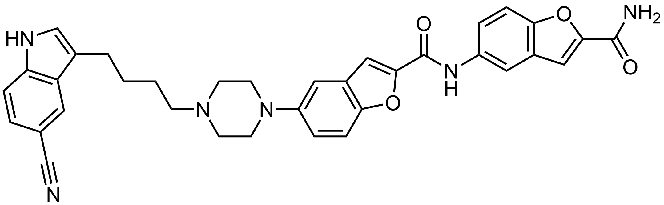 Synonyms: N-(2-carbamoylbenzofuran-5-yl)-5-(4-(4-(5-cyano-1H-indol-3-yl)butyl)piperazin-1-yl)benzofuran-2-carboxamid