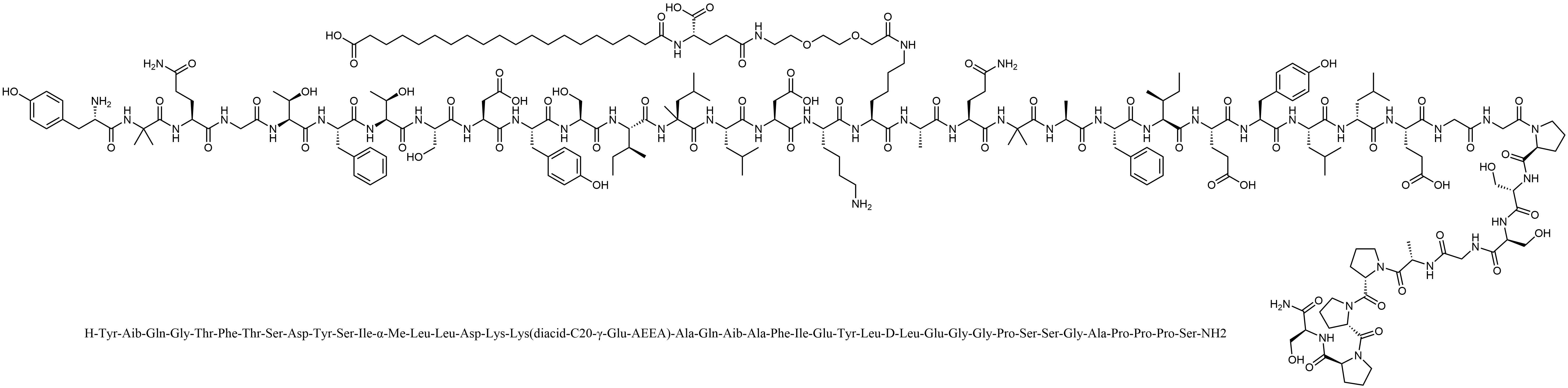 Synonyms: H-Tyr-Aib-Gln-Gly-Thr-Phe-Thr-Ser-Asp-Tyr-Ser-Ile-α-Me-Leu-Leu-Asp-Lys-Lys(diacid-C20-γ-Glu-AEEA)-Ala-Gln-Aib-Ala-Phe-Ile-Glu-Tyr-Leu-D-Leu-Glu-Gly-Gly-Pro-Ser-Ser-Gly-Ala-Pro-Pro-Pro-Ser-NH2