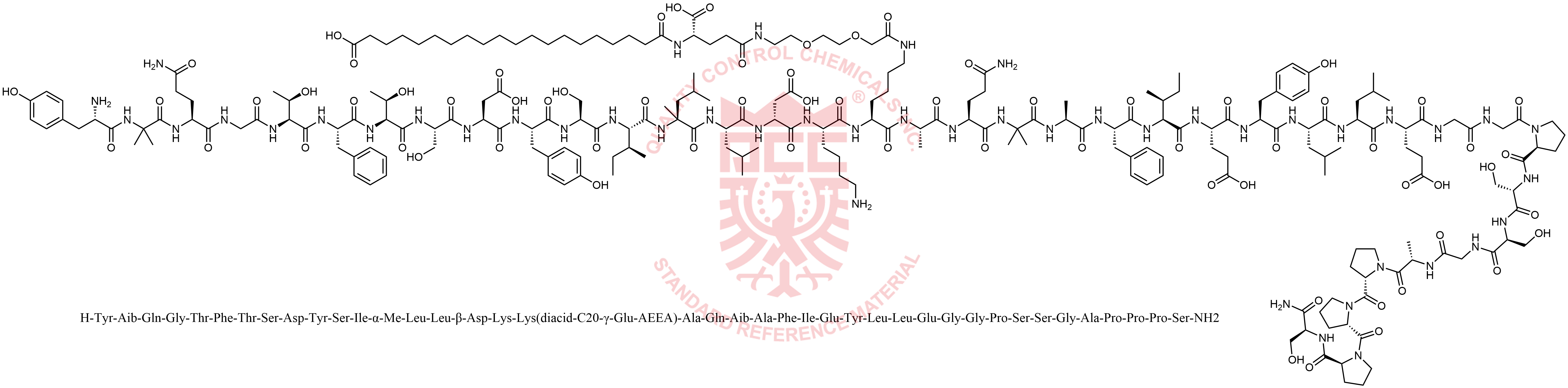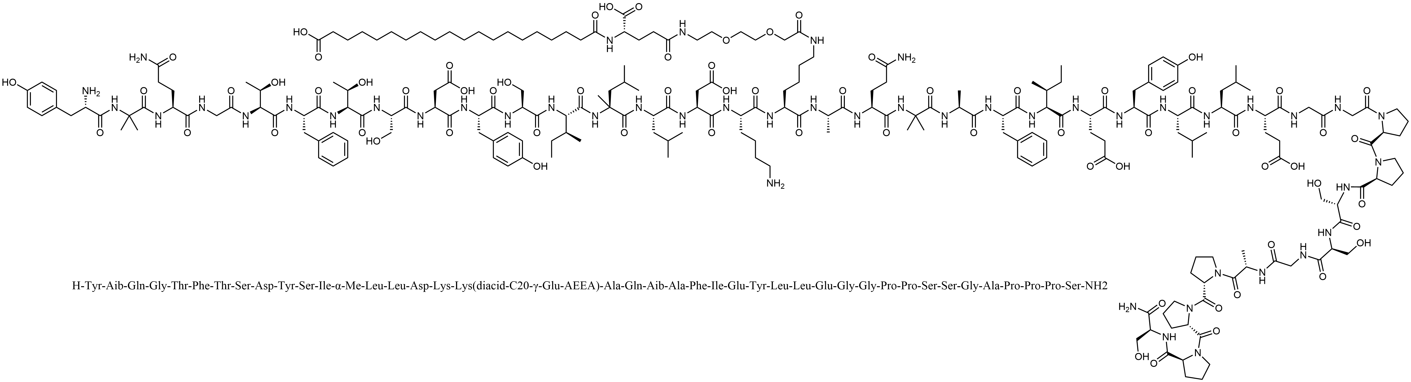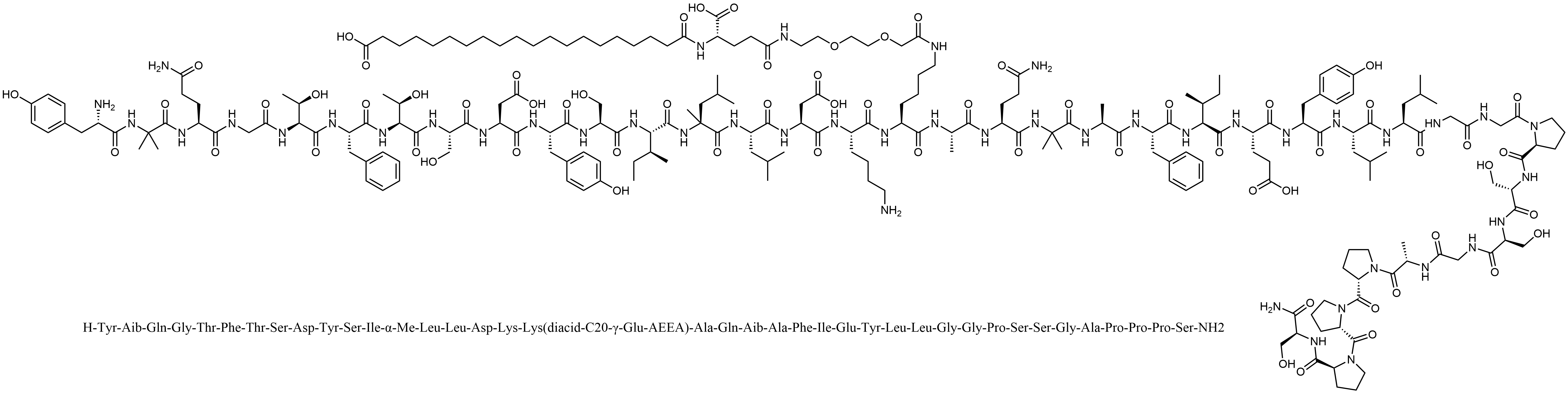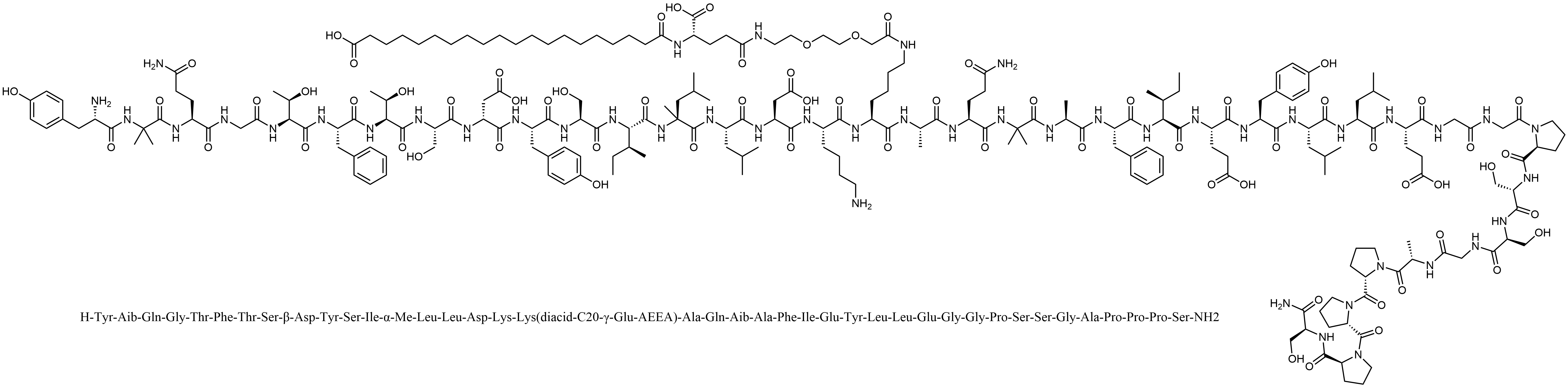 Synonyms: H-Tyr-Aib-Gln-Gly-Thr-Phe-Thr-Ser-Asp-Tyr-Ser-Ile-α-Me-Leu-Leu-Asp-Lys-Lys(diacid-C20-γ-Glu-AEEA)-Ala-Gln-Aib-Ala-Phe-Ile-Glu-Tyr-Leu-Leu-Gly-Gly-Pro-Ser-Ser-Gly-Ala-Pro-Pro-Pro-Ser-NH2
