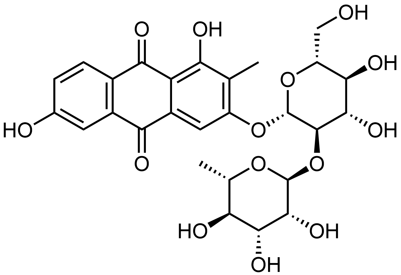 Synonyms: 3-(((2S,3R,4S,5S,6R)-4,5-dihydroxy-6-(hydroxymethyl)-3-(((2S,3R,4R,5R,6S)-3,4,5-trihydroxy-6-methyltetrahydro-2H-pyran-2-yl)oxy)tetrahydro-2H-pyran-2-yl)oxy)-1,6-dihydroxy-2-methylanthracene-9,10-dione