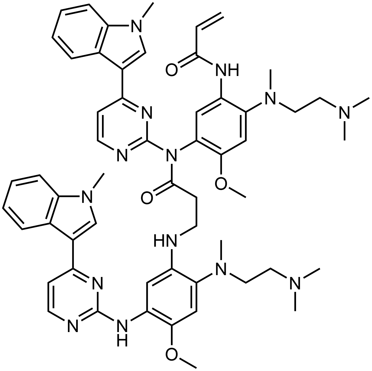 Synonyms: N-(2-((2-(dimethylamino)ethyl)(methyl)amino)-5-(3-((2-((2-(dimethylamino)ethyl)(methyl)amino)-4-methoxy-5-((4-(1-methyl-1H-indol-3-yl)pyrimidin-2-yl)amino)phenyl)amino)-N-(4-(1-methyl-1H-indol-3-yl)pyrimidin-2-yl)propanamido)-4-methoxyphenyl)acrylamide