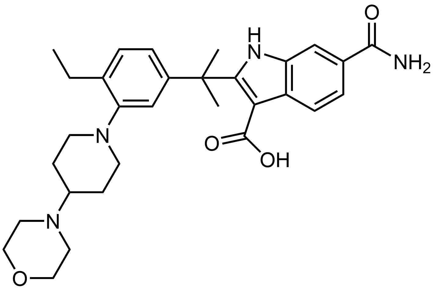 Synonyms: 6-carbamoyl-2-(2-(4-ethyl-3-(4-morpholinopiperidin-1-yl)phenyl)propan-2-yl)-1H-indole-3-carboxylic acid