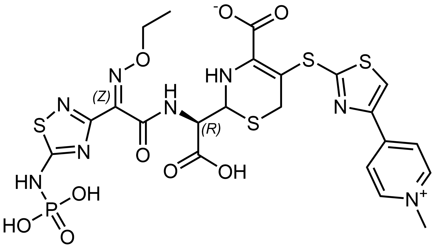 Synonyms: 2-((R)-carboxy((Z)-2-(ethoxyimino)-2-(5-(phosphonoamino)-1,2,4-thiadiazol-3-yl)acetamido)methyl)-5-((4-(1-methylpyridin-1-ium-4-yl)thiazol-2-yl)thio)-3,6-dihydro-2H-1,3-thiazine-4-carboxylate