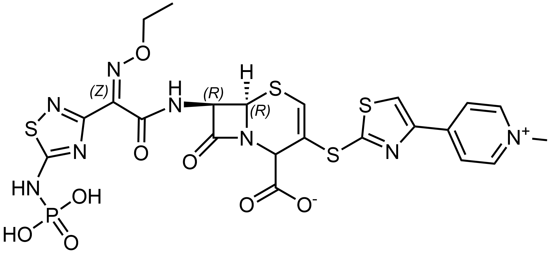 Synonyms: (6R,7R)-7-((Z)-2-(ethoxyimino)-2-(5-(phosphonoamino)-1,2,4-thiadiazol-3-yl)acetamido)-3-((4-(1-methylpyridin-1-ium-4-yl)thiazol-2-yl)thio)-8-oxo-5-thia-1-azabicyclo[4.2.0]oct-3-ene-2-carboxylate