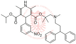 Synonyms: 3-(1-((3,3-diphenylpropyl)(methyl)amino)-2-methylpropan-2-yl) 5-isopropyl 2,6-dimethyl-4-(3-nitrophenyl)-1,4-dihydropyridine-3,5-dicarboxylate