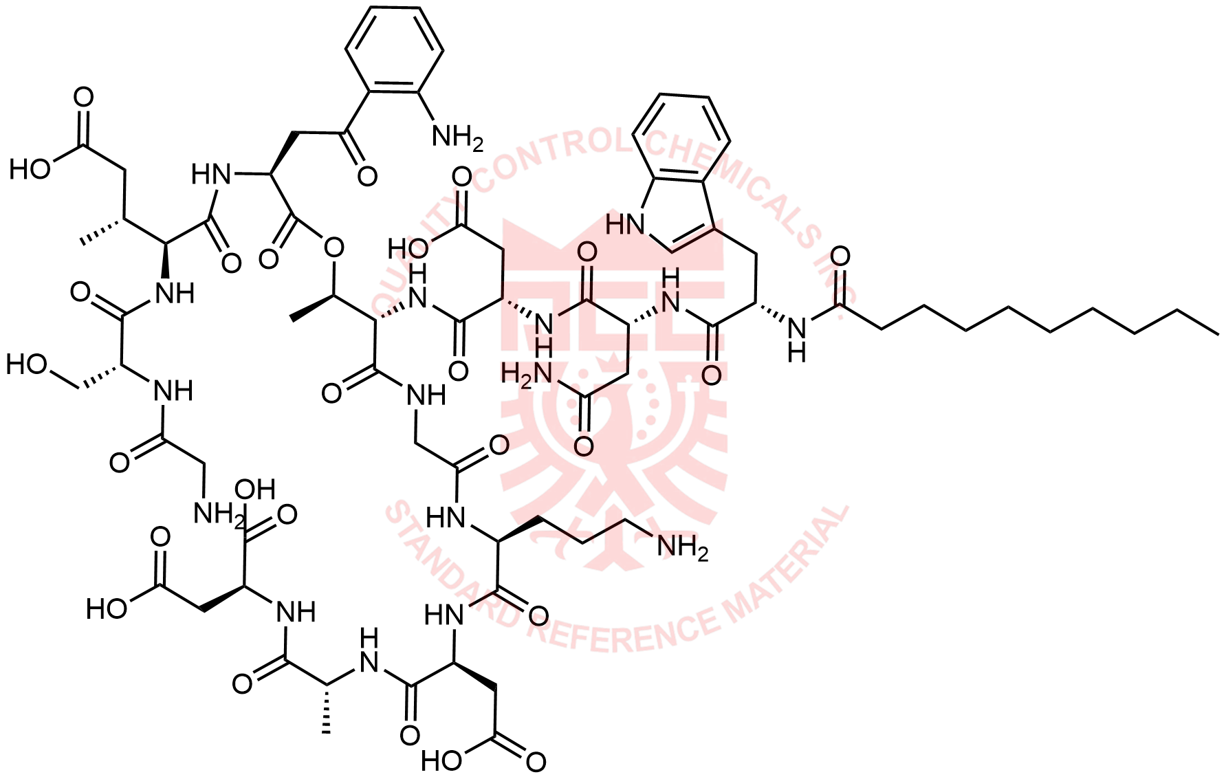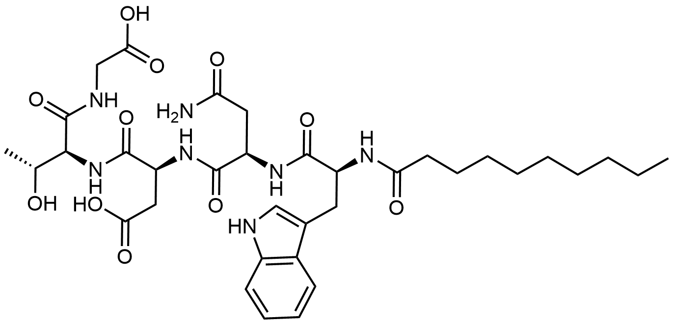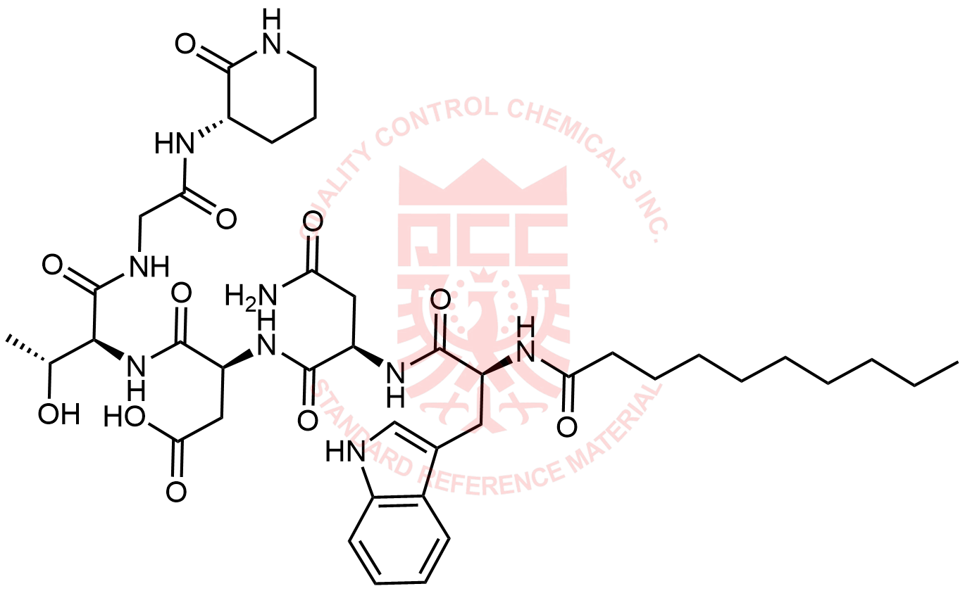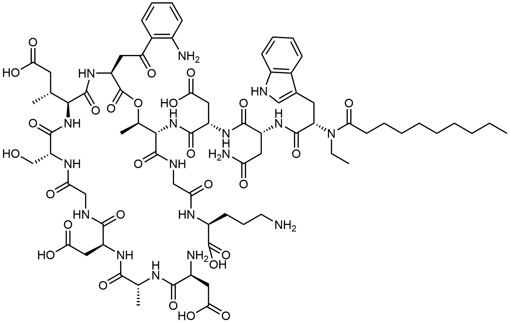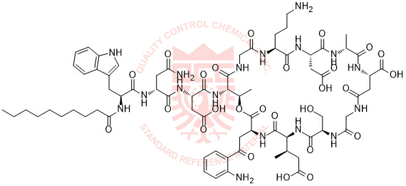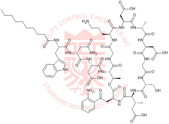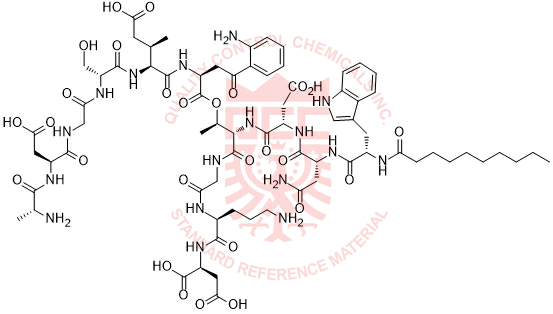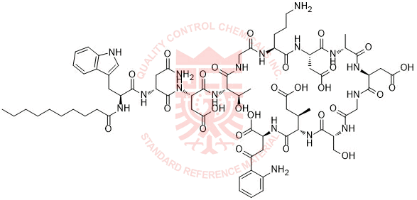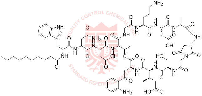 Synonyms: (3S)-3-((R)-4-amino-2-((S)-2-decanamido-3-(1H-indol-3-yl)propanamido)-4-oxobutanamido)-4-(((5R,8S,11S,14R,15S,21S,24S,27R,30S)-11-(2-(2-aminophenyl)-2-oxoethyl)-21-(3-aminopropyl)-24-(carboxymethyl)-8-((R)-1-carboxypropan-2-yl)-5-(hydroxymethyl)-14,27-dimethyl-3,6,9,12,16,19,22,25,28,32,33-undecaoxo-13-oxa-1,4,7,10,17,20,23,26,29-nonaazabicyclo[28.2.1]tritriacontan-15-yl)amino)-4-oxobutanoic acid